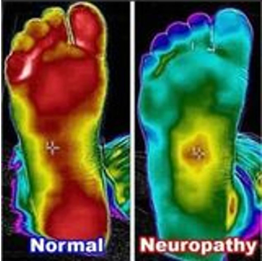 Thermography showing less heat on the right due to possible Neuropathy loss of circulation.
